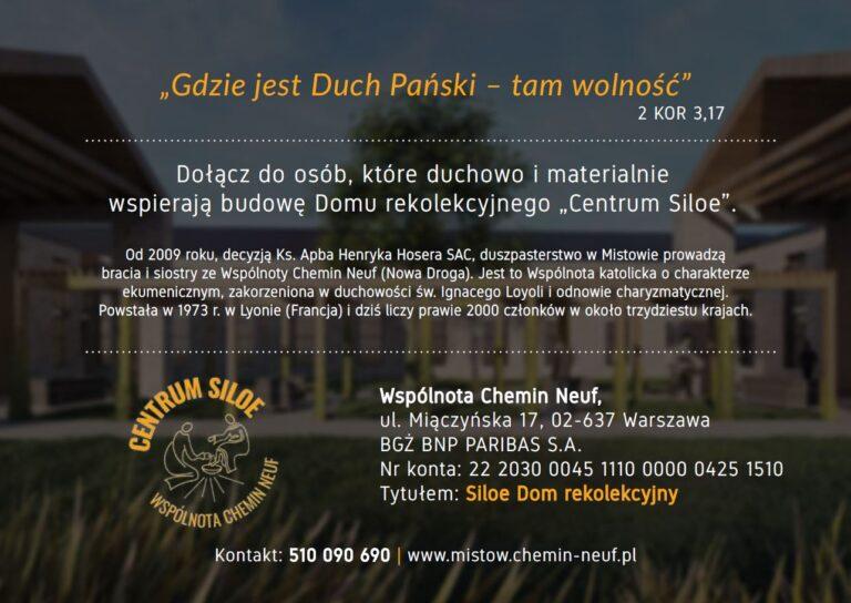 Zbiórka na SILOEPrzez Redakcja / 10 listopada 2020 Dziękujemy za każdą wpłatę!Przekazaliśmy zebrane środki na budowę Centrum SILOE w Mistowie – ośrodka rekolekcyjnego, którego misją będzie duchowa i terapeutyczna pomoc w uzdrowieniu wewnętrznym człowieka.Bez Was nie mogło się to udać, DZIĘKUJEMY!